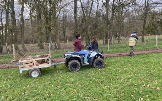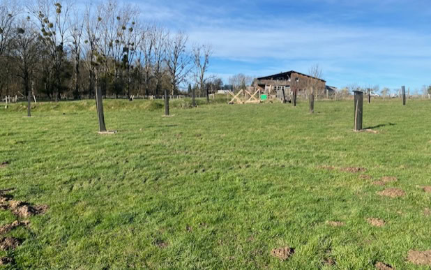 Menée de concert avec l’association Fermes d’Avenir, qui assure le lien entre des entreprises finançant les arbres et des structures agricoles souhaitant développer des projets de plantation à impact environnemental positif, cette action a permis la mise en terre d’un petit pré-verger d’une cinquantaine d’arbres fruitiers (pommiers et pêchers), ainsi que la plantation de 400 mètres de haies fourragères multi-espèces.