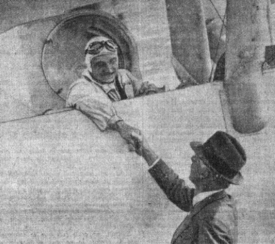 Fig. 3 et 4 : 15h45 sur l’aérodrome de Toussus-le-Noble. Après une chaleureuse poignée de main échangée avec le constructeur du F.1001 Henri Farman, Marcel Cogno s’envole pour son dernier voyage vers la stratosphère.